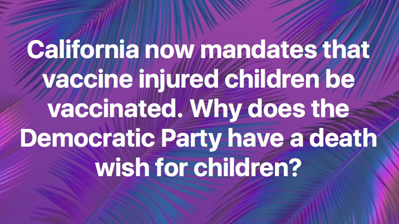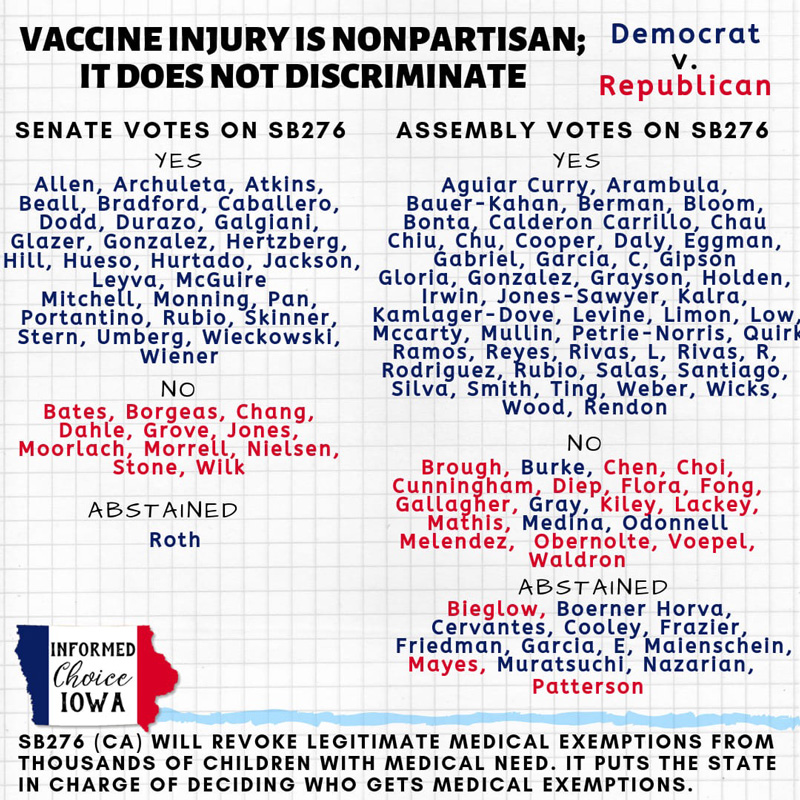 But our legislative system operates on majority vote, so, when there is a majority of Democrats running the show in a state and a MAJORITY of them are going to vote for vaccine mandates because they are voting for an agenda, what’s the solution? More “education?” AB2109 > SB277 > SB267 & SB714 > yes, HOMESCHOOLERS are next. And then adults. >>> No, the solution is not “more education” (that’s not to say we should not try); the solution is to vote for those who we know have a high probability of opposing vaccine mandates, and that’s REPUBLICAN.