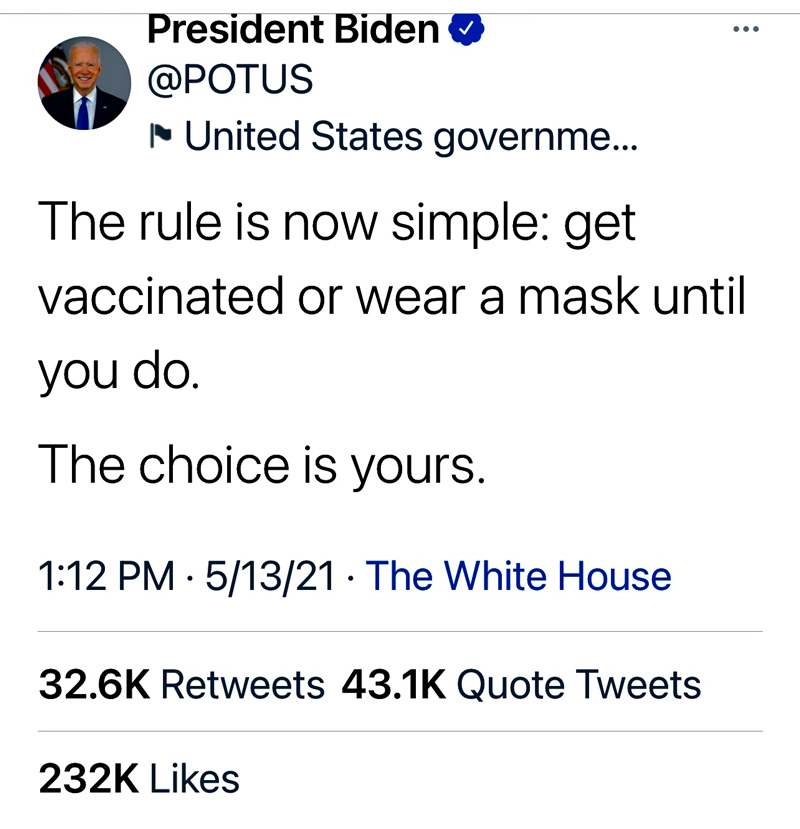 With this new normal, it can feel like we are living in a crazy-land. Even our top politicians have taken a strangely paternalistic obey-us-or-else tone. President Biden tweeted earlier in the week: “The rule is now simple: get vaccinated or wear a mask until you do. The choice is yours.”