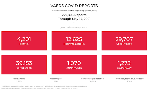 The following graphic (from openVAERS.com) shows the reported deaths and injuries from the COVID vaccine from the US government’s Vaccine Adverse Effects Reporting System (VAERS):