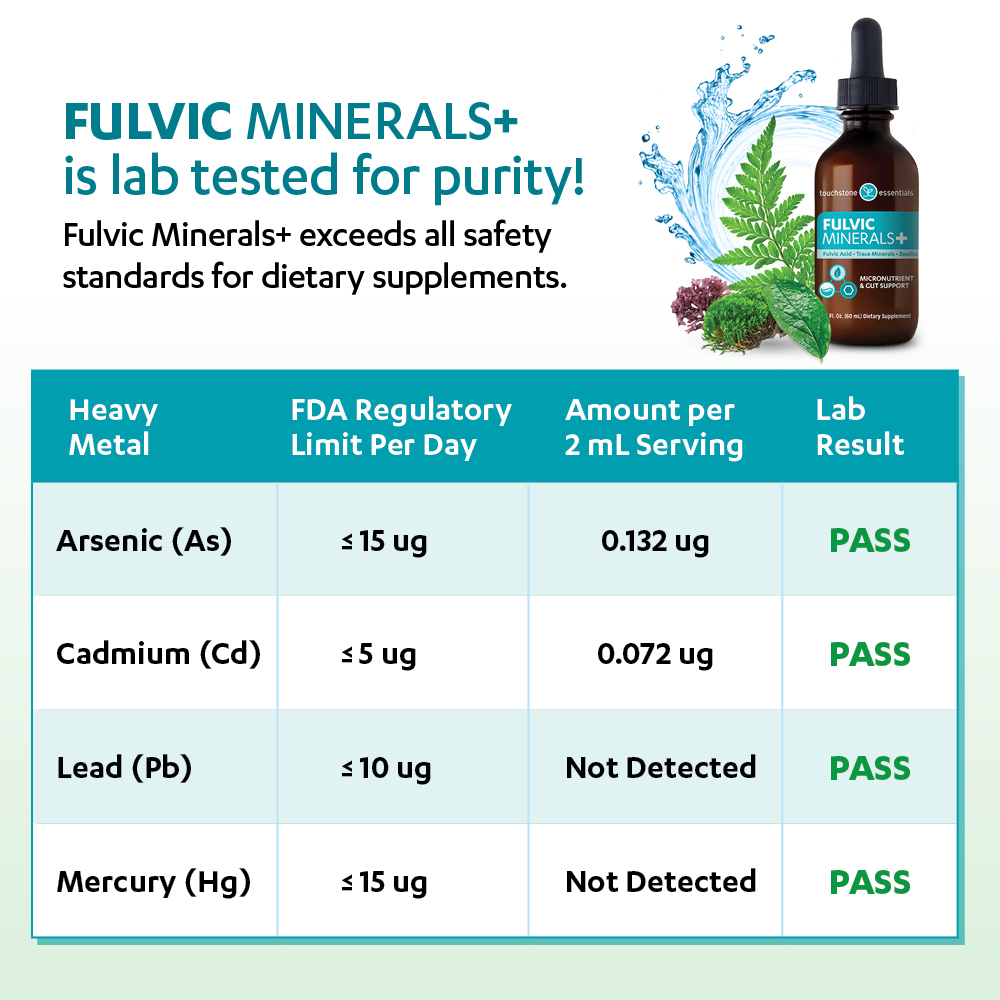 In addition to testing on each ingredient, the finished product is tested by an independent laboratory to affirm it is extremely LOW in heavy metals, so you can enjoy all the benefits of fulvic acid and trace minerals, without any concern of toxins.