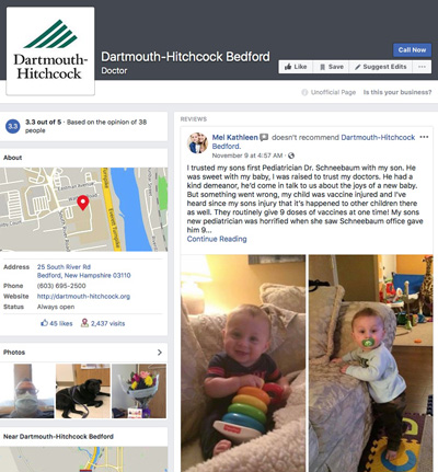 The review I left for the pediatrician at Dartmouth Hitchcock-Bedford that vaccine injured my son got over 500 shares and thousands of likes, then I was blocked. It received an overwhelming amount of comments from people with stories, many exactly like ours!