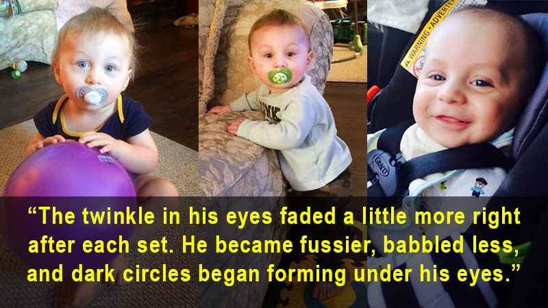 Mel: Looking back at the thousands of pictures and videos we have and looking at the dates of the vaccines, you can see in the photos the drastic changes. The twinkle in his eyes faded a little more right after each set. He became fussier, babbled less, and dark circles began forming under his eyes. The pediatrician told me a little regression is normal…I really wanted to believe that so badly! Denial set in.