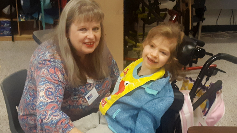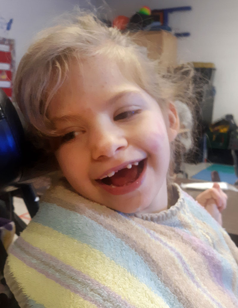 Phoebe is a lovely, beautiful, and strong girl. She knows no stranger and everybody loves her. She loves life and loves to laugh. She has intelligence, but is trapped in a badly functioning body. She walks in a walker, but generally sits all day. She loves Elmo, Barney, and Caillou. She is always happy and loves to sing.
