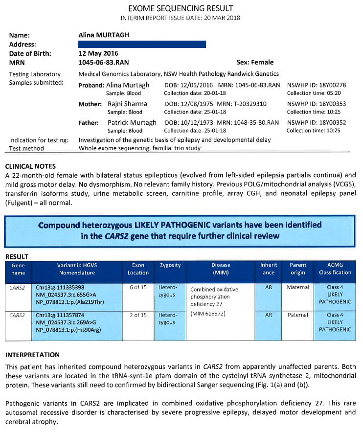 They suggested that CARS2 gene is most likely the cause of her condition. What’s very important to note is that kids with mitochondrial disorders show elevated levels of lactate, but Ali had not shown any signs of elevated lactate. So I don’t believe that Ali even had a mitochondrial disorder.