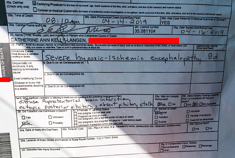 The death certificate shows “severe hypoxic-ischemic encephalopathy” which is lack of oxygen and blood flow. Other contributing factors on the death certificate include: diffuse supratentorial brain infarction, ectopic posterior pituitary, and absent pituitary stalk.