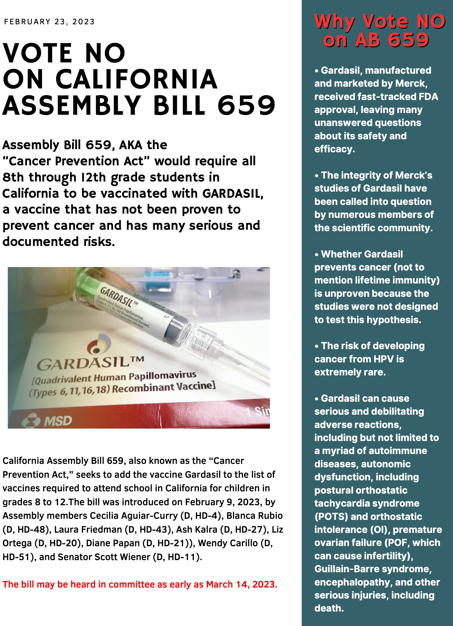 Assembly Bill 659, AKA the “Cancer Prevention Act” would require all 8th through 12th grade students in California to be vaccinated with GARDASIL, a vaccine that has not been proven to prevent cancer and has many serious and documented risks.
