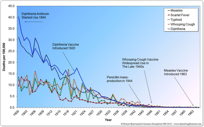The same pattern is true for diphtheria, typhoid, scarlet fever and whooping cough (notice the spike in diphtheria after introduction of the vaccine).