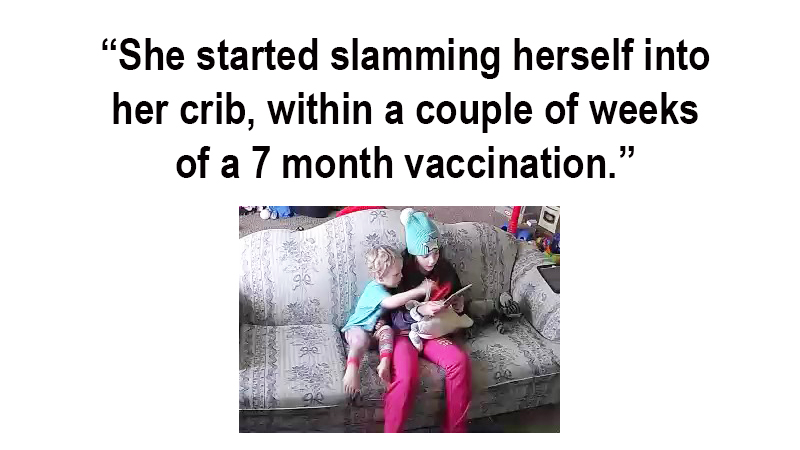 I stopped letting them shoot her up but the damage has been done. She started slamming herself into her crib, within a couple of weeks of a 7 month vaccination. Her eye started to wander at the same timeframe. She woke ten + times a night, ever since, to slam her head and back into her crib, over and over until I’d have to pat her back to sleep.