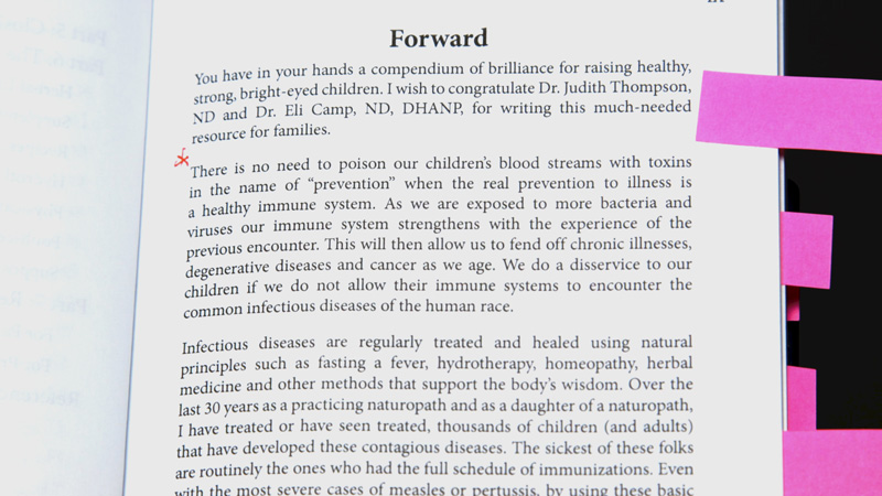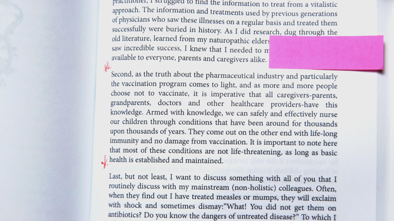 Let me jump to closing thoughts by Dr. Camp, one of the co-authors on this book. She says, Second, as the truth about “the pharmaceutical industry and particularly the vaccination program comes to light and as more and more people choose not to vaccinate, it is imperative that all caregivers, parents, grandparents, doctors and other healthcare providers have this knowledge. Armed with knowledge, we can safely and effectively nurse our children through conditions that have been around for thousands upon thousands of years. They come out on the other end with life-long immunity and no damage from vaccination. It is important to note here that most of these conditions are non-life-threatening, as long as basic health is established and maintained.
