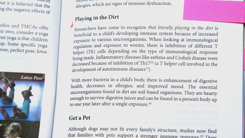 Playing in the dirt. Researches have come to recognize that literally playing in the dirt is beneficial to a child’s developing immune system because of increased exposure to various microorganisms. When looking at immunological regulation and exposure to worms, there’s inhibition of different T helper cells depending on the type of immunological response being made. Inflammatory diseases like asthma and Crohn’s disease were decreased because of inhibition of Th17, a T helper cell involved in the development of autoimmune diseases. So as you can see, we need to play in the dirt.