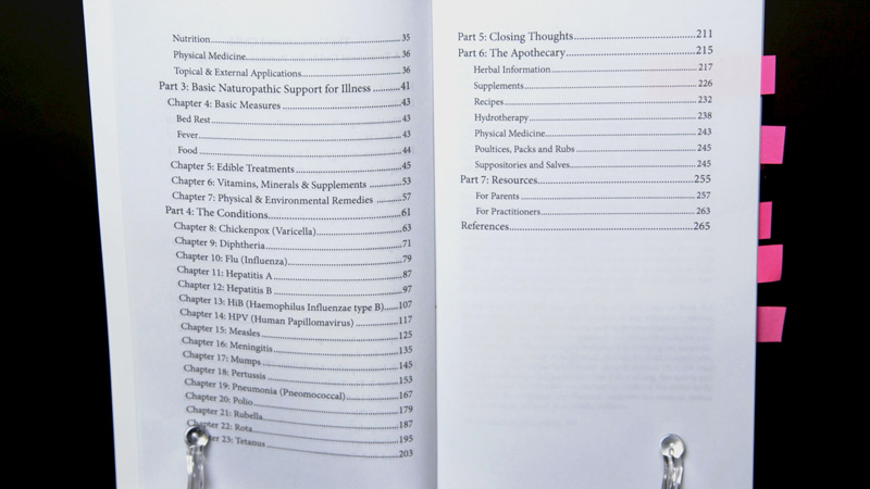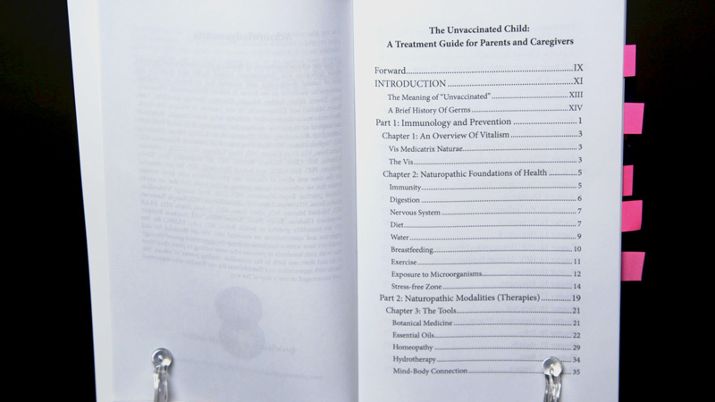 We have our introduction, a quick overview of what the meaning of unvaccinated is. Then we go into immunology and prevention and a quick overview of vitalism, how vital the energy is in the child. Chapter two, which has naturopathic foundations of health, immunity, digestion, nervous system, diet, water, breastfeeding, exercise, exposure to micro organism and stress-free zone, naturopathic modalities, which are the therapies, the tools, botanical medicine, essential oils, homeopathy, hydrotherapy which is hot and cold therapy, and mind-body connection, nutrition, physical medicine, and topical and external applications. Then we have part three, basic naturopathic support for illness.