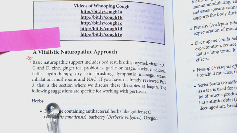 So I mention that all of the different disease that we vaccinate are in this book. And I decided to go to whooping cough or pertussis because it’s a hot topic right now. Here’s a vitalistic approach to pertussis. Now this is just one very small paragraph. They outline exactly what to do if your child gets whooping cough, but here’s the quick summary.