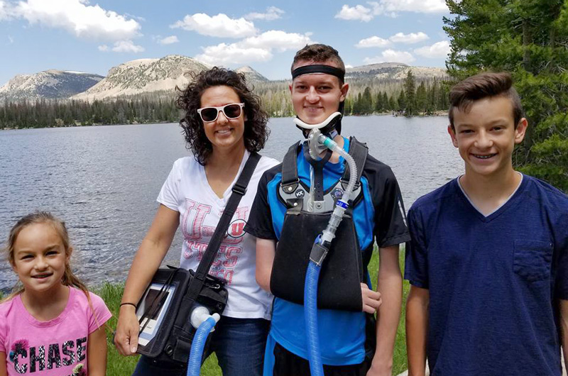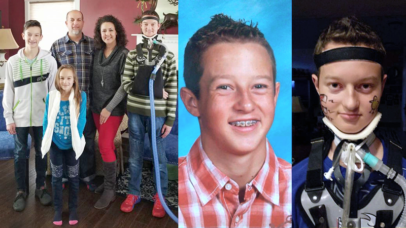 Colton was originally diagnosed with Acute Longitudinal Transverse Myelitis; C1 through T-12 were affected (Cervical-1, through Thoracic-12). The inflammation in his spinal cord caused the paralysis which started in his neck and full right arm. His left arm was starting to lose function and become paralyzed. Colton was also having difficulty breathing, so intubation and a ventilator were needed. Paralysis continued spreading throughout his body and it was not too long before Colton lost his speech ability. Able only to communicate using the “thumbs up or thumbs down” method, that was soon halted due to loss of movement in his thumbs. Colton’s new reality included daily therapy to avoid infection and pneumonia, irregular temperature regulation, hot/cold packs for the spikes and drops in temperature, being uncomfortable with a cervical collar, and all this with a 15 pound ventilator/breathing machine. His family referred to this as his “ball and chain.”