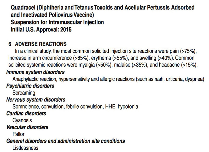 Most parents have never looked at a vaccine manufacturer insert that lists all of the details about the vaccine, including adverse reactions. Although the pro-vaccine apologists often say these are just for “legal reasons,” the fact remains that injuries are actually reported on these inserts and it behooves every parent to review a few of them. They can often be many, many pages long. Pay close attention to the above image (a partial screenshot from a four page document) and notice the “Psychiatric disorder” category. It’s a really interesting one because screaming – often very high pitched and a terror filled scream at that – is due to massive brain swelling and the absolute EXTREME PAIN in the brain. So, is it actually accurate to call that a “psychiatric” issue?! Also note “convulsions” and the many other disorders that this vaccine can cause. And this is just ONE VACCINATION!