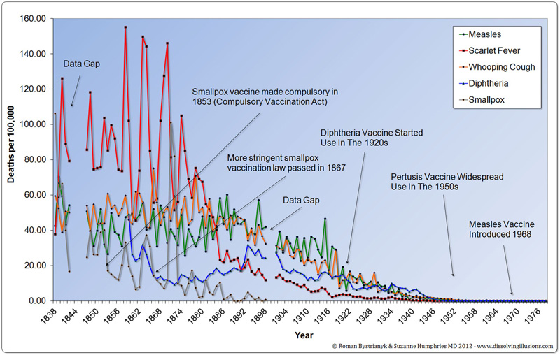 Death from infections declined dramatically prior to the introduction of most vaccines due to better sanitation (plumbing and waste removal), refrigeration to prevent food spoilage, the use of powerful natural and holistic healing remedies, the ending of child labor and the overall improvement of living, which allowed for robust health. For example, death from measles in the USA declined 99.96% before the vaccine was ever introduced. A healthy immune system has the ability to go through the infection process without incident in the vast majority of cases; and typically if there are complications, these are due to nutrient deficiencies or other treatment or susceptibility issues, not a lack of toxic vaccines. Understanding of the history of vaccination and how vaccines never actually saved us from infections – and if anything, have made our situation worse – can be found in Dr. Suzanne Humphries, MD seminal work, Dissolving Illusions: Disease, Vaccines, and the Forgotten History.