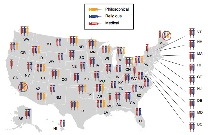 A vaccine exemption is what allows a child to attend school without being vaccinated. The three types of vaccine exemptions are philosophical, religious and medical. In simple terms, a philosophical or religious exemption requires the filling out of some forms and an exemption is granted. On the other hand, a medical exemption requires a medical doctor to state that the child is too medically fragile to receive vaccines but unfortunately, the vast majority of medical doctors are unwilling to issue a medical exemption, for any reason. Prior to 2015, two states – Mississippi and West Virginia – were the only states where only medical exemptions are allowed to opt out of vaccines. That changed in 2015 when Governor Brown signed into law SB 277 which removed all exemptions except medical in California. Since that time over 100 legislative bills are introduced every year in dozens of states attempting to remove religious and/or philosophical exemptions as the liability-free vaccine industry continues its push to force vaccinate every man, woman and child on the planet. New York and Maine have recently enacted strict vaccine mandate laws. Click over to the National Vaccine Information Center State Vaccine Requirements to review the exemption options you have in your state.